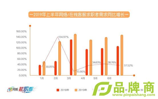 58同城招聘研究院数据显示,2019年上半年,互联网企业的网络/在线客服、电话客服招聘需求量同比增长明显,尤其在2月份,网络/在线客服招聘需求增幅达69.15%,电话客服达70.89%。